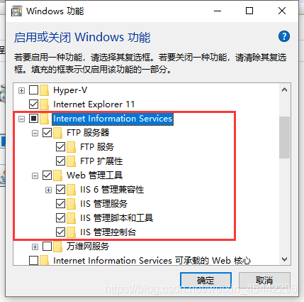 3、找到“Internet Information Service ( Internet信息服務 )”,選中“FTP服務” 和 “Web管理工具”點擊確定