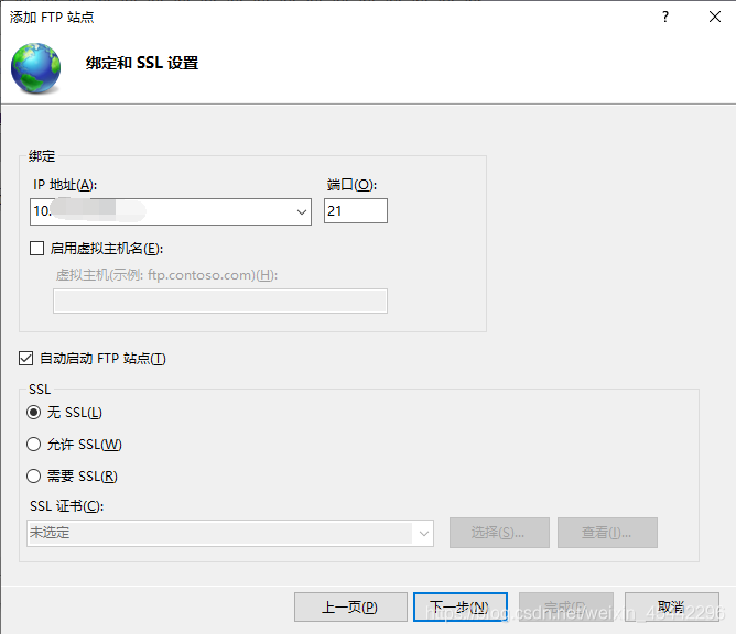 7、選擇本機IP地址,端口默認21就可以,選擇“無SSL”,下一步